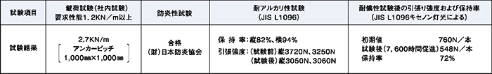 | ■スマートメッシュ 材質・品質規格 基布素材:高強力ビニロン系 表面被覆:PVC皮膜(塩ビ系合成樹脂) 編み方:緯糸挿入ラッセル網 編み目:目合い8mm×8mm 繊維目付量:280g/m2以上 破断伸度:5×5(%)以上 |